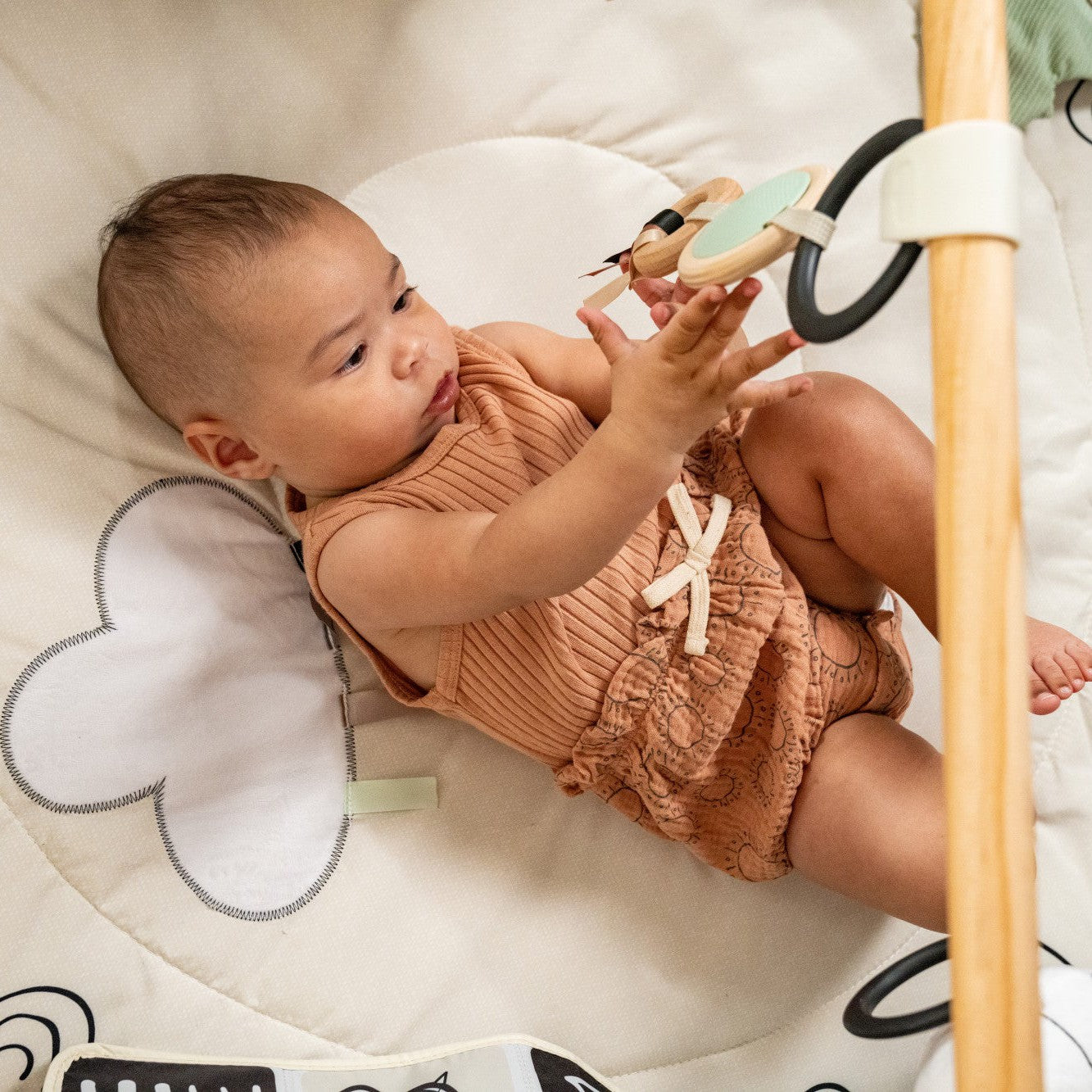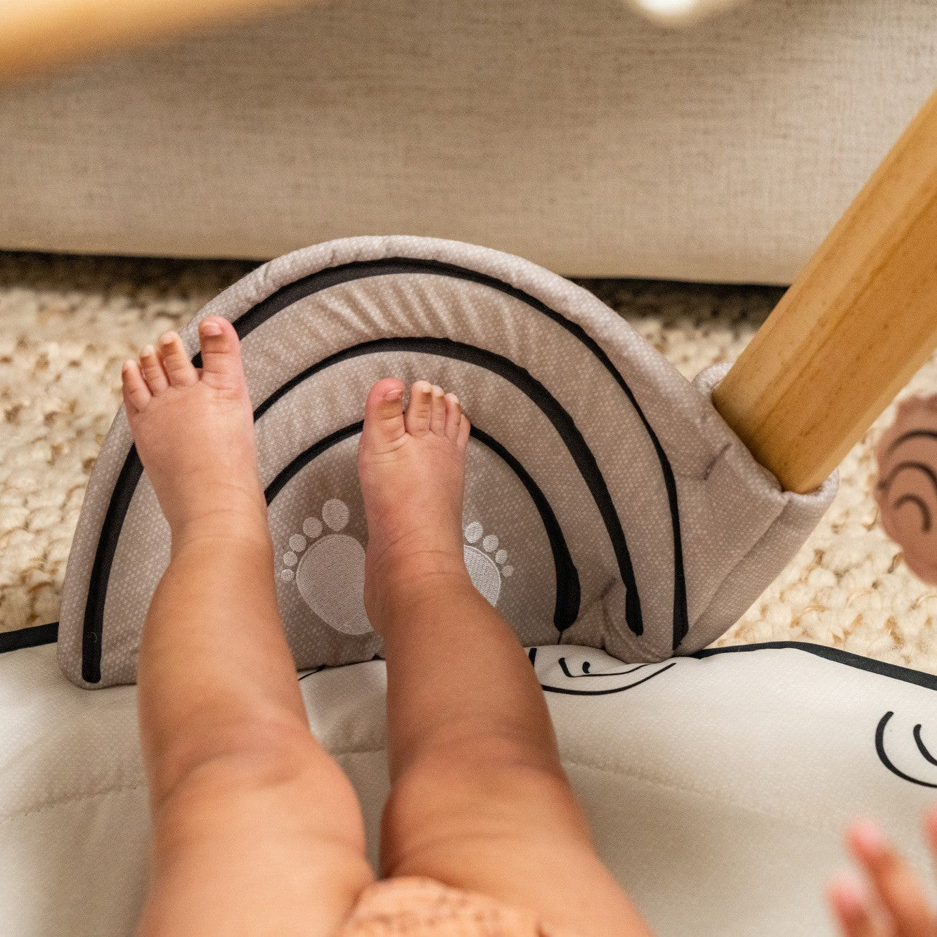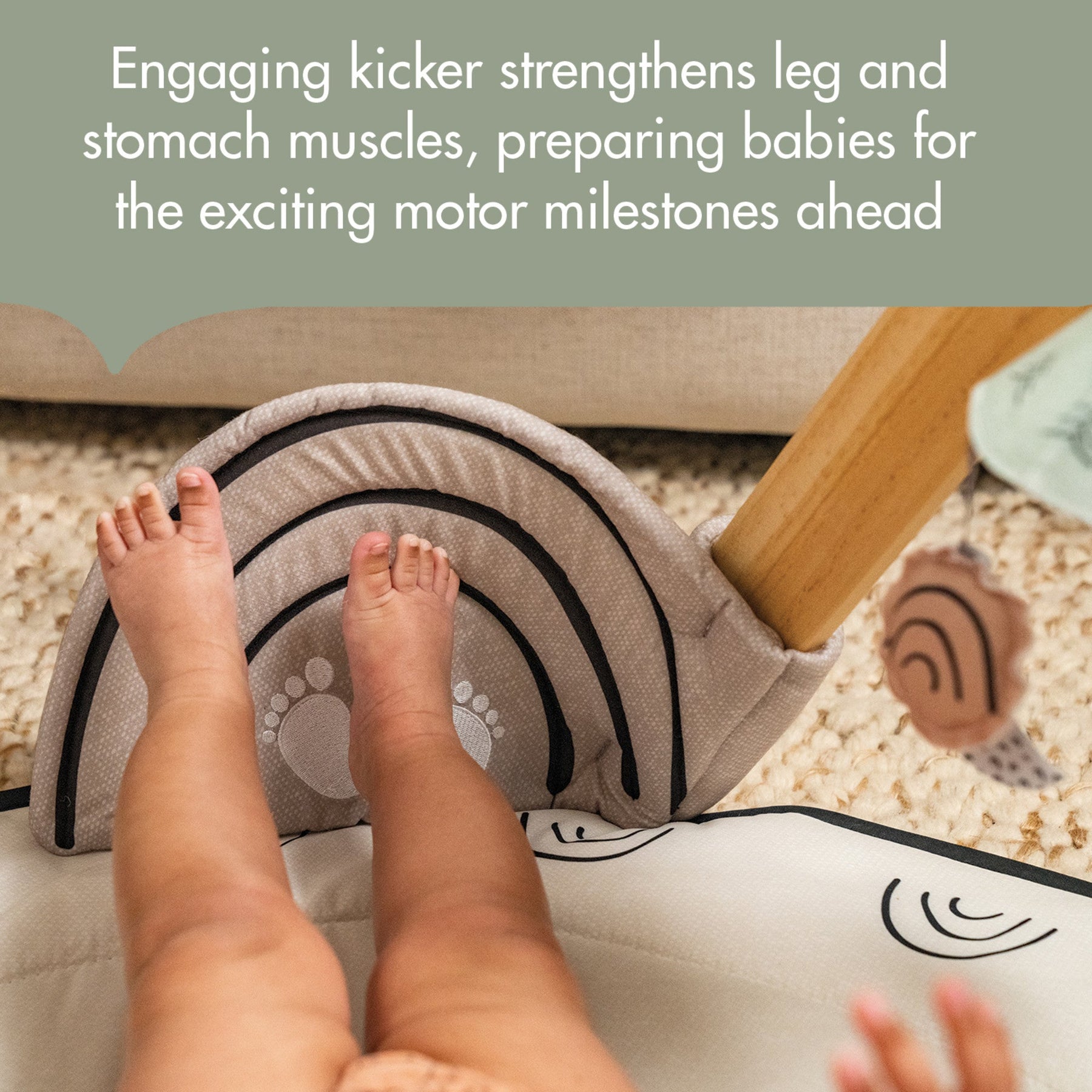 Babies will be delighted by the charming interactive musical lion toy, geometric contrasting mobile, giant rainbow kicker, double-sided picture book, and crinkly toys as they learn through play and exploration. Uniquely designed with a stand-alone, natural wooden toy arch, the Gymini will entertain your baby from the newborn months through the sitting stage while adding a trendy décor accent to your home.