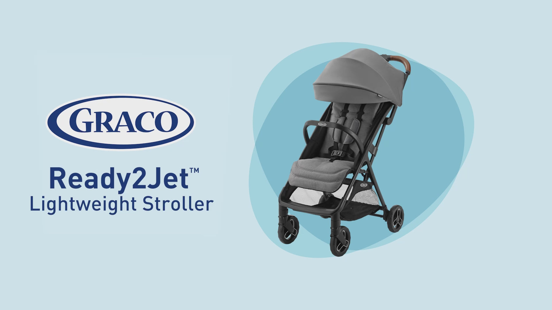The Graco® Ready2Jet™ Compact Stroller features an automatic, self-fold with one-hand activation that makes it easy to fold and unfold, while its self-standing fold keeps your hands free. Weighing just 13.2 lb—less than two gallons of milk—this compact stroller is fully-featured and ultra lightweight! Experience the added convenience of a collapsible travel stroller that's overhead friendly* for ultimate portability, making it the perfect airport companion. Your child will ride in comfort with a multi-position reclining seat and adjustable calf support under a UV 50 oversized canopy with visor, while the easy-access storage basket helps keep parent and baby travel essentials in a one safe place. All-wheel suspension ensures a smooth ride. Parents will love the included parent cup holder and stylish leatherette stroller handle. The removable belly bar doubles as a carry handle for even more convenience. *We recommend checking with your local airline prior to departure for specific carry-on requirements.