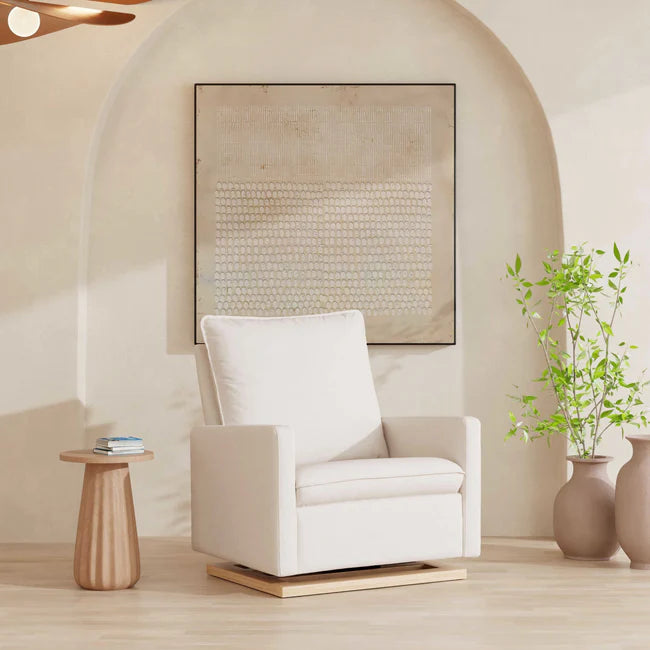 Our popular Cali Pillowback Glider has been reimagined to fit more than one with its extra wide seat – perfect for nursing twins or cuddling up with your toddler. Designed with a high plush pillowback for head and neck support, gently lull your babe to sleep in comfort with its smooth gliding base. It's a stylish but also more sustainable choice for the modern nursery. Upholstered by hand in our eco-performance fabric, that is stain resistant, water repellent, and made with at least 30% recycled materials.