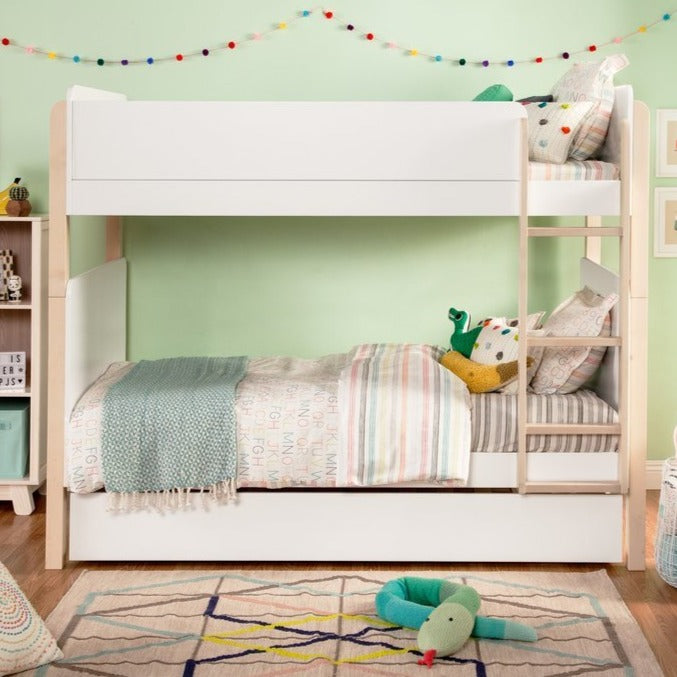 The TipToe Bunk Bed is the perfect solution for two sharing a room or simply for sleepovers with besties. Featuring a sturdy integrated ladder that can be placed on either side to work with any room configuration, best of all the TipToe easily converts into two individual twin size beds. With playful rounded edges and contrasting colors and made with sustainably sourced non-toxic materials, it fits a standard twin-size bed mattress (sold separately, box spring not required). Pair it with the Universal Twin Storage Trundle Bed (sold separately) and other Babyletto accessories and dressers to build a chic, modern bedroom.