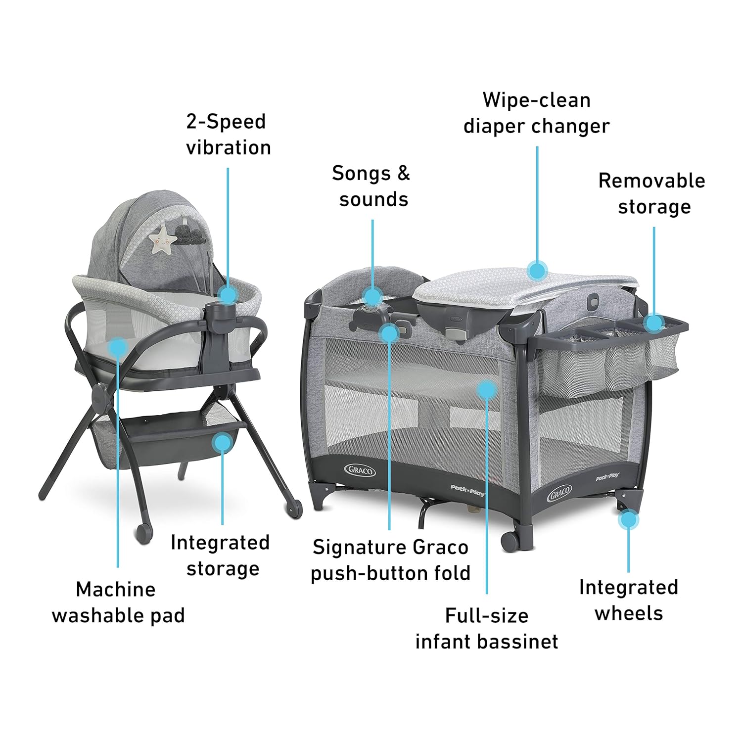 The Graco Pack 'n Play Day2Dream Bassinet Deluxe Playard features a portable bassinet and included stand for baby to rest comfortably and always close by. The portable bassinet can be used attached to the playard, on the included stand, and can rock when used on the floor. The portable bassinet includes 2-speed vibration, a large machine-washable mattress cover, and a full-sized canopy. All components of the Day2Dream Bassinet Deluxe Playard work effortlessly together to create an all-in-one day and night sleep solution.