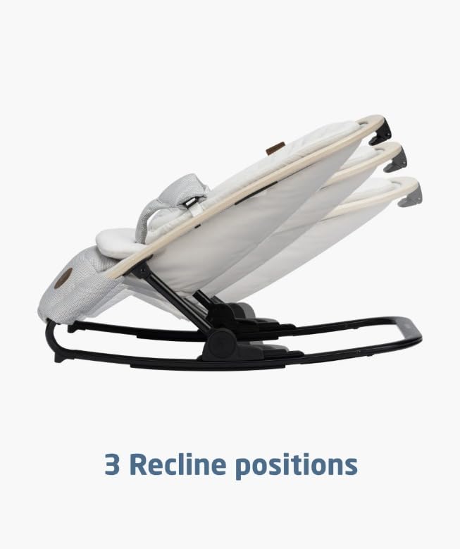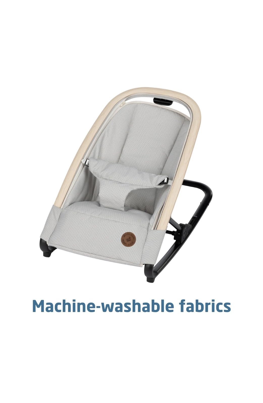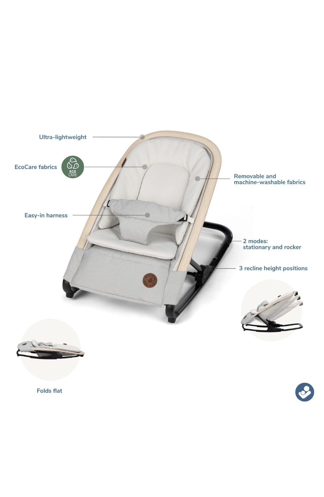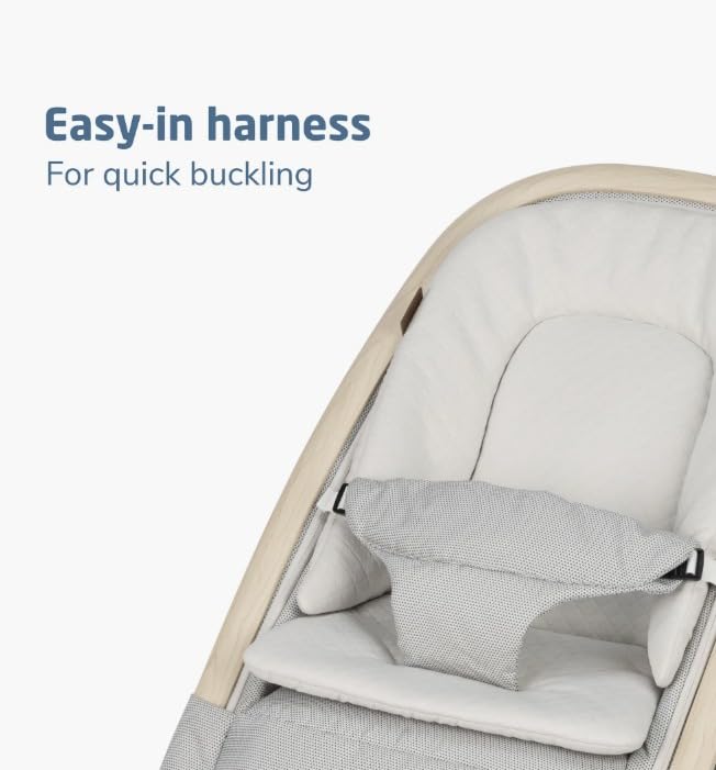 Additional features: With two modes—rocker and stationary—and three-position recline that's one-hand adjustable, this is a must-have for soothing baby. The stylish aluminum frame with a woodgrain finish and monochrome grey fabric lends a contemporary update to the piece, and the sleek design allows the chair to fold flat and be securely stored when not in use. The Easy-In harness keeps your little one secured, while the soft, comfortable and breathable EcoCare fabric is made from recycled fibers sourced from plastic bottles.