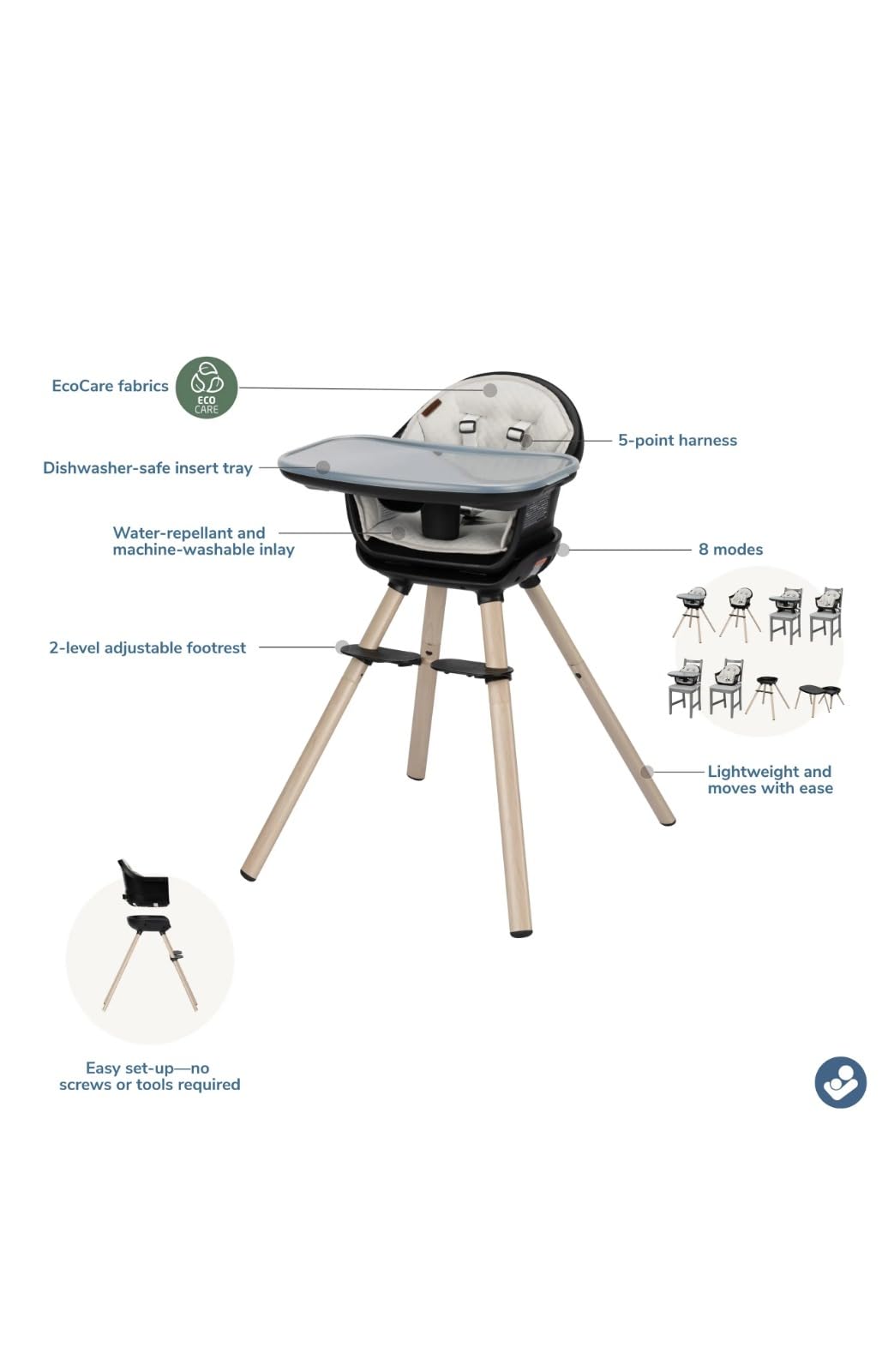 Mealtimes are messy, that’s why Moa is designed for easy clean-up. With a water-repellent machine-washable inlay, washable 5-point harness, and dishwasher-safe insert tray, your little one’s mealtime area is sure to stay as clean as you want it to be.