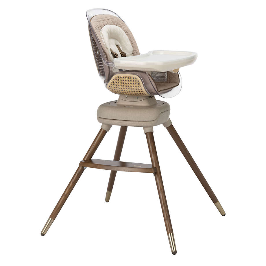 Quality-crafted with soft, breathable fabric and sturdy tapered ash wood legs, the stylish Maxi-Cosi® Kiskadee High Chair grows with them from babyhood all the way through the big-kid years. In high-chair modes, the seat rotates 360° in an upright position with the touch of a button (stopping at every 90°). This means it's easier than ever to feed and interact with your little one. With seven nifty modes in all, this ultra-adaptable design converts from an infant high chair to a booster seat to a big-kid stool. Not your typical high chair, the sturdy, clear acrylic seat features stylish embedded caning to complement your home's decor. And its smooth, molded bucket shape leaves no crevices for crumbs, making cleanup a breeze.