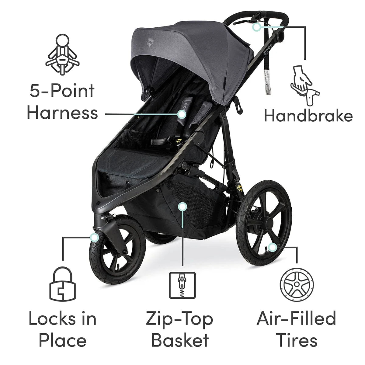 Small enough to go anywhere, flexible enough to go everywhere. Wayfinder pairs a sleek-and-slim stroller design with high-performance jogging features to give you the best of both worlds. Whether cruising streets or crushing miles—you’re in for a smooth ride. Independent dual suspension and air-filled tires keep you strolling steady on bumpy sidewalks and rocky roads. Front wheel swivels for easy steering on walks or strolls, and locks into place when you’re ready to run.