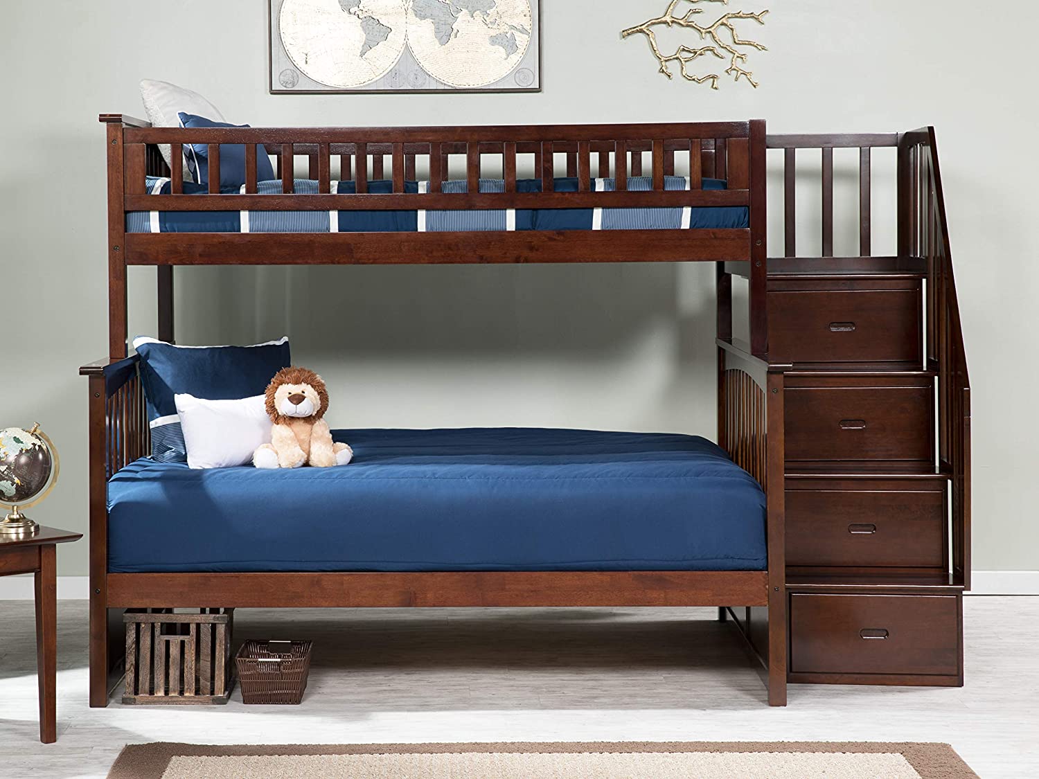 Constructed in solid Sustainably Sourced hardwood, in several high build durable finishes, the Columbia Bunk Bed has a built-in modesty panel, and can accommodate either under-bed storage drawers or a trundle. With 26 steel reinforcement points and two 14-piece slat kits, this bed is as sturdy as they come. With so many sleep options and a space-saving design, Atlantic Furniture's Columbia Bunk Bed will surely become your child's favorite sleepy time fort. Rest easy knowing you can trust this bed's quality, safety, and value.