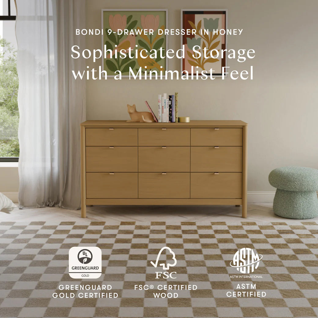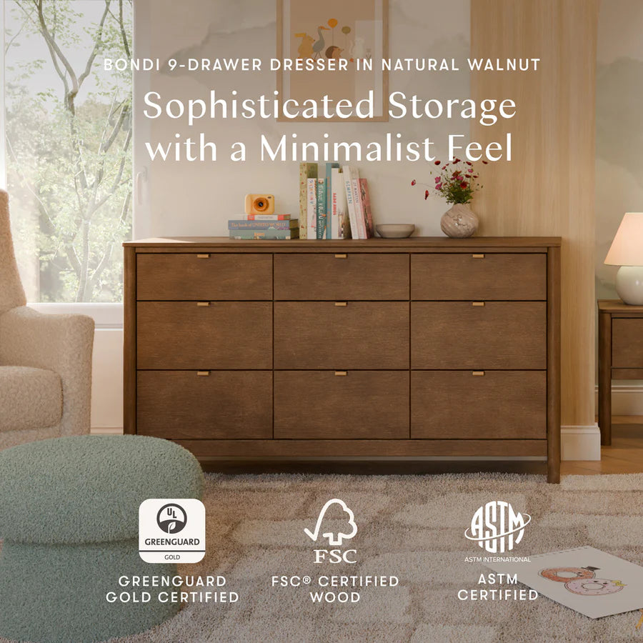 Designed to grow alongside your kiddo and keep up with their constantly changing needs, the Bondi 9-Drawer Assembled Dresser by Babyletto combines clean lines and rounded posts, plenty of storage, and soft vegan leather pulls for a modern look that fits right into any big-kid space. With nine roomy drawers and a fully assembled design (yes, really!), the Bondi 9-Drawer Assembled Dresser by Babyletto is ready to handle everything from tiny socks to oversized imaginations.