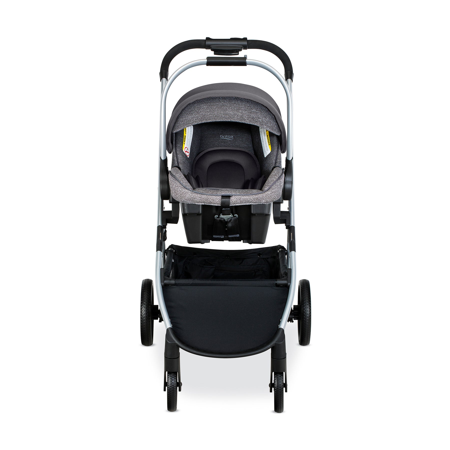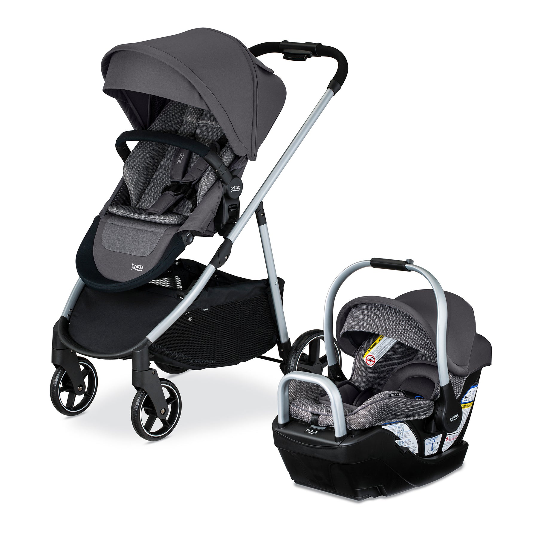 Make every moment effortless with the Britax Willow Grove SC baby travel system. This infant car seat and stroller combo includes the Britax Willow SC infant car seat, Alpine car seat base and Grove modular stroller. First ride jitters? Gone. Britax is the only brand with ClickTight® technology so you know it can be installed securely on the first ride and beyond. Made for multitasking, this Britax infant car seat features an aluminum carry handle that easily adjusts with one hand to keep the other hand free. The RightSize™ system provides adjustment points at the hips, shoulders and between the legs to help you find the perfect fit from the start. When it's time to cruise, attach the car seat to the Grove baby stroller and take on the town. Made for children up to 50 lbs, the Grove baby stroller features 6 different strolling positions—including both parent-facing and forward-facing—so your child can look up at you or out to the world. The included washable CozyFit™ insert allows babies as small as 10 lbs to ride in this toddler stroller when the seat is fully reclined. The one-step fold lets you pack up and go with trunk space to spare. The Grove stroller comes with an extra-large cargo basket plus 5 additional pockets for valuables, drinks and your little one's must-haves. Fabrics are naturally flame retardant with no added FR chemicals. The Willow Grove SC infant travel system pairs trusted car seat safety with a fully loaded stroller to give you the best of both worlds.