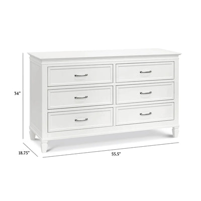 Bring the elegance of romantic French country inspired style into the home with the Darlington 6-Drawer Dresser. The dresser balances classic raised molding on six drawer fronts, delicate tapered feet, and accent satin nickel drawer handles. All spacious drawers feature dovetail construction with self-closing, ball-bearing drawer glides. Available in a Warm White finish.