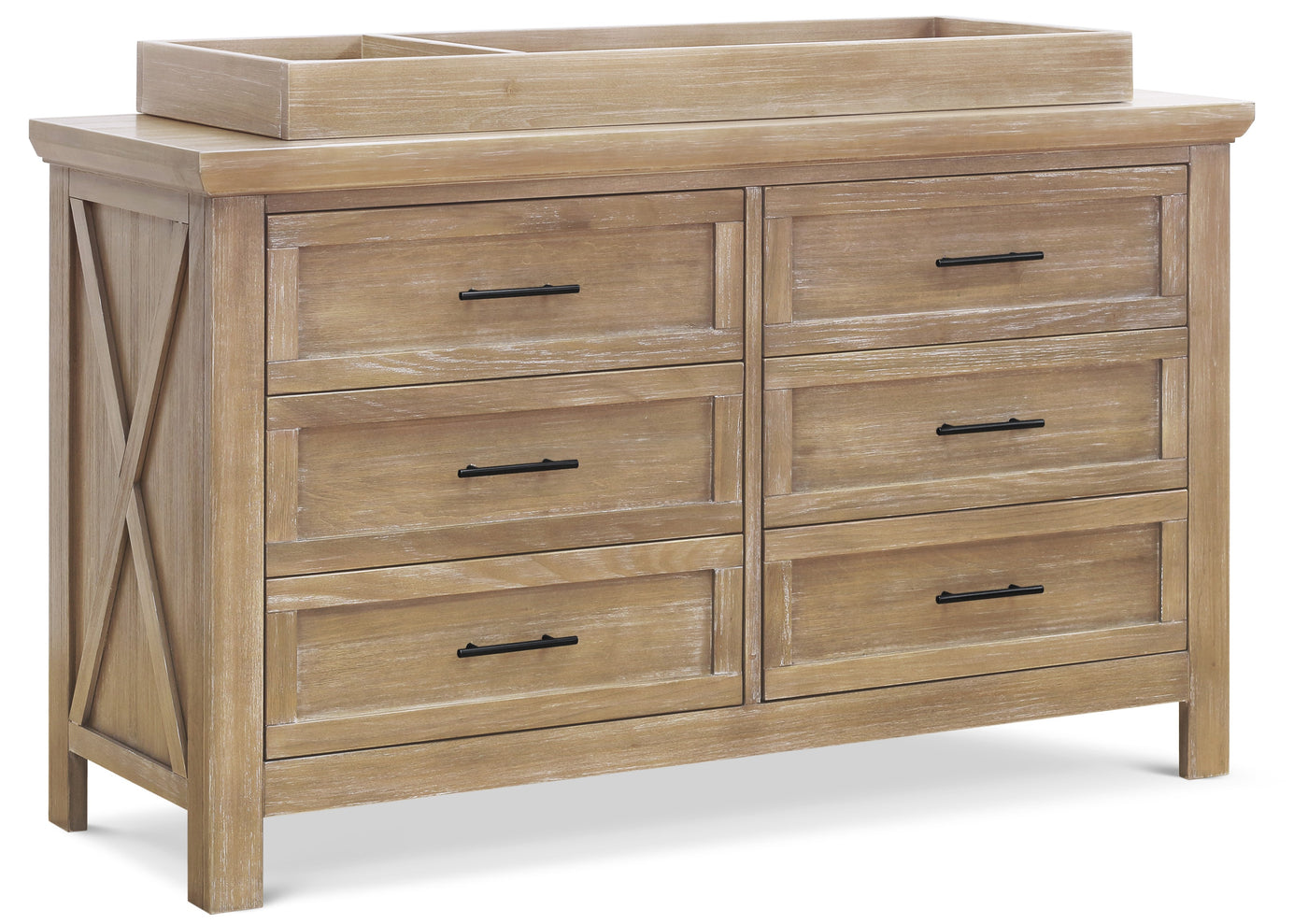 The Emory Farmhouse 6-Drawer Dresser is the perfect companion to the Emory Farmhouse 4-in-1 Convertible Crib. With matching thoughtful X-brace details and a beautifully textured finish inspired by hand-crafted barn doors, the double dresser is the perfect accent piece to complete your rustic nursery.