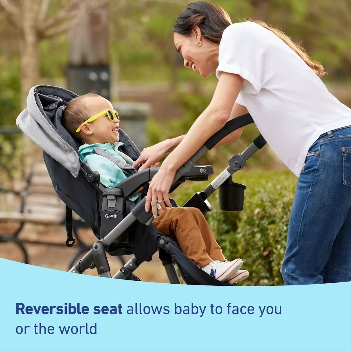 - Reversible seat allows baby to face parent or the world