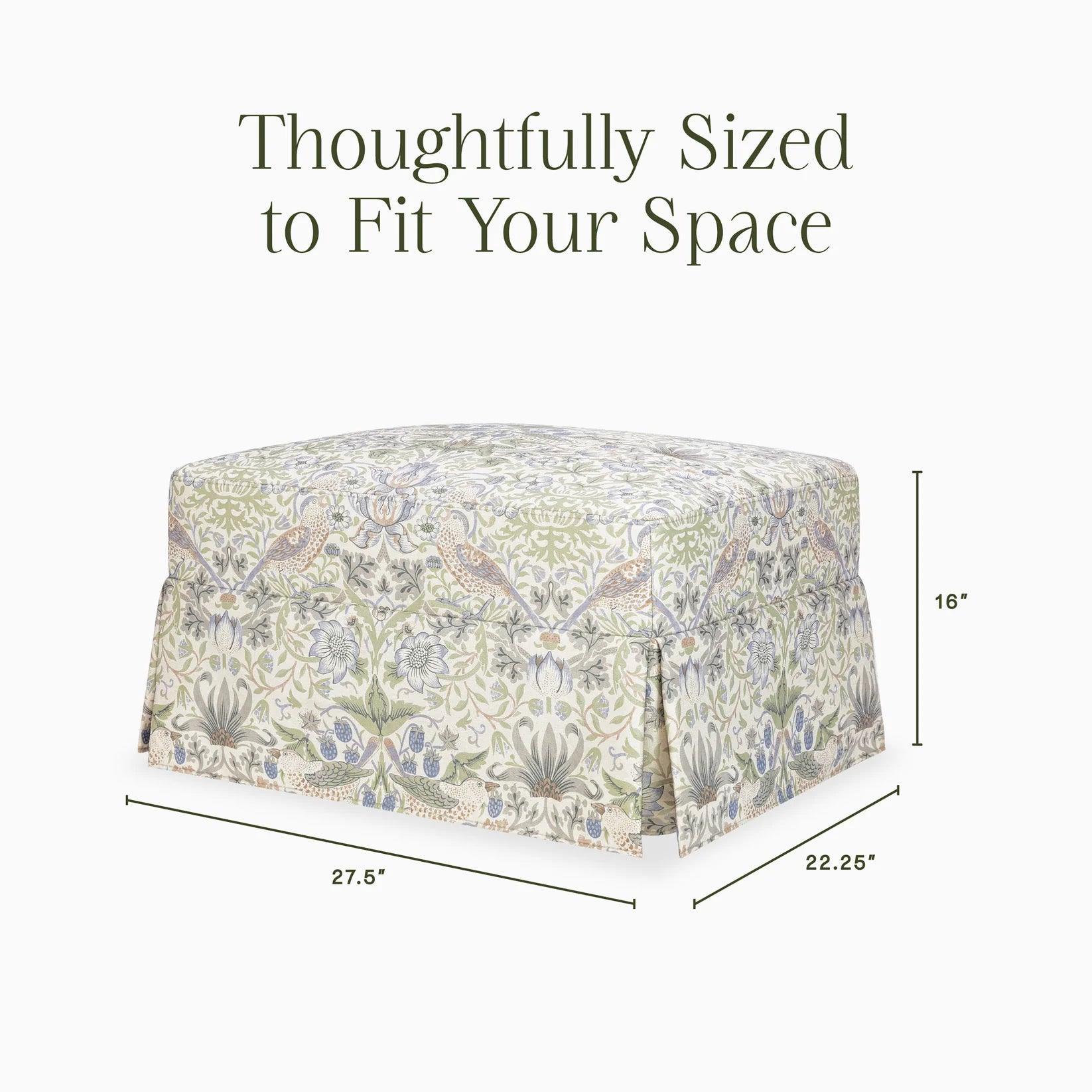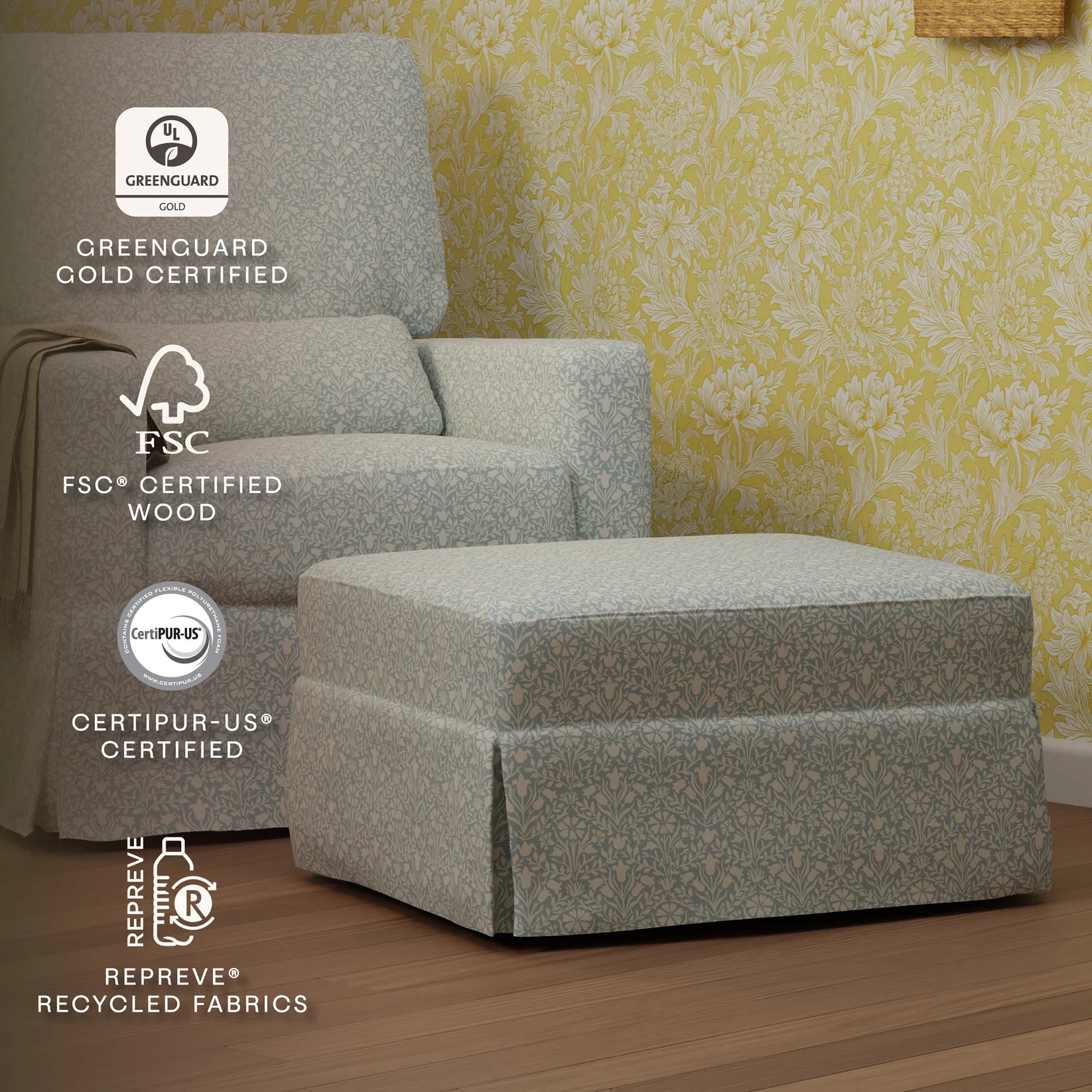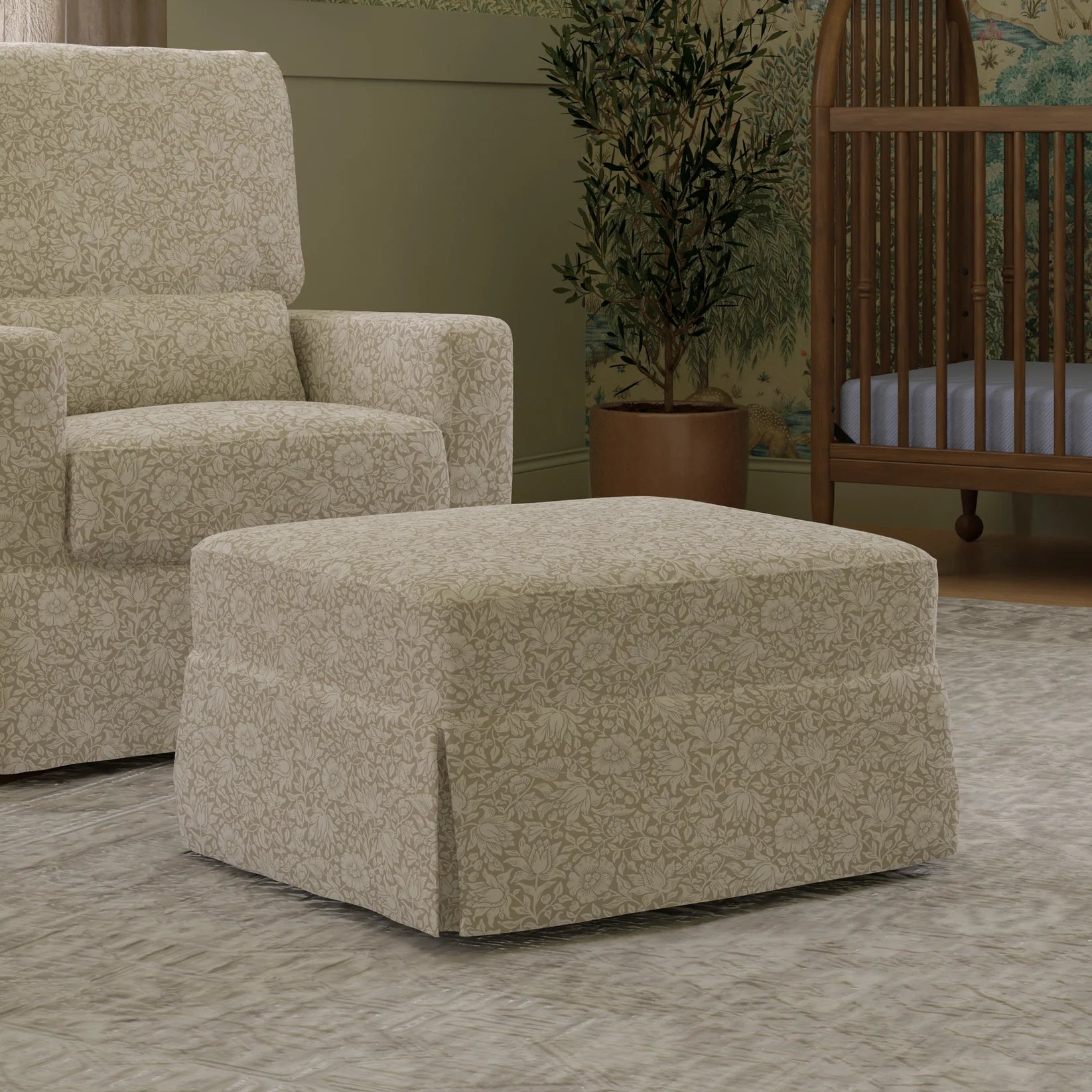 Rooted in the Arts and Crafts movement, Morris & Co. celebrates the beauty of the natural world, traditional craftsmanship, and hand-painted artistry. Our collaboration brings their iconic, richly layered prints to life on our Crawford Gliding Ottoman. The Crawford Ottoman offers a modern take on traditional style and brings nursery comfort to a new level. Pairs perfectly with our popular Crawford Pillowback Swivel Glider.