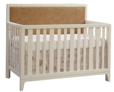 • Semi-encased buttonless upholstered panels (No choking hazards!) available in Talc linen and Caramel bonded leather.