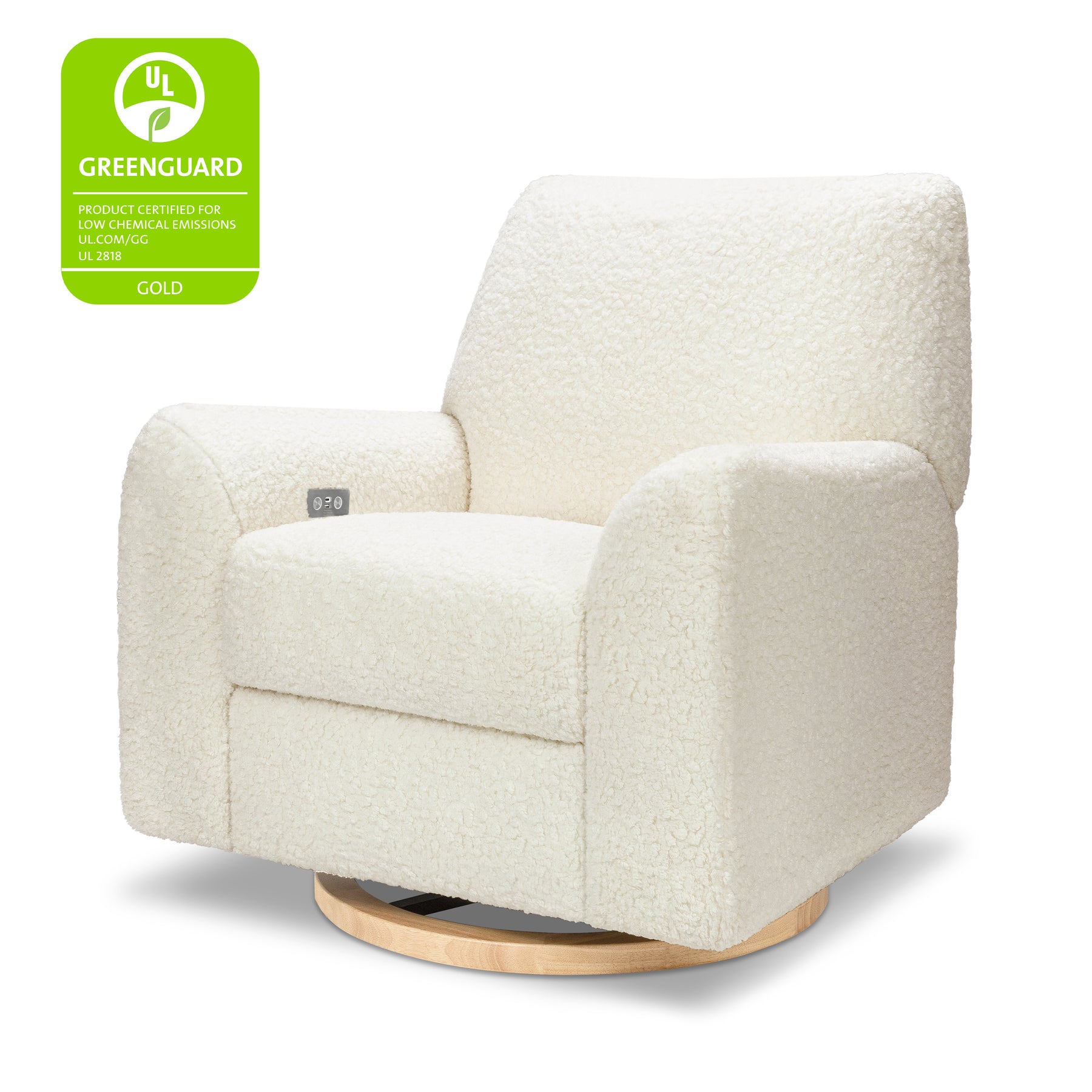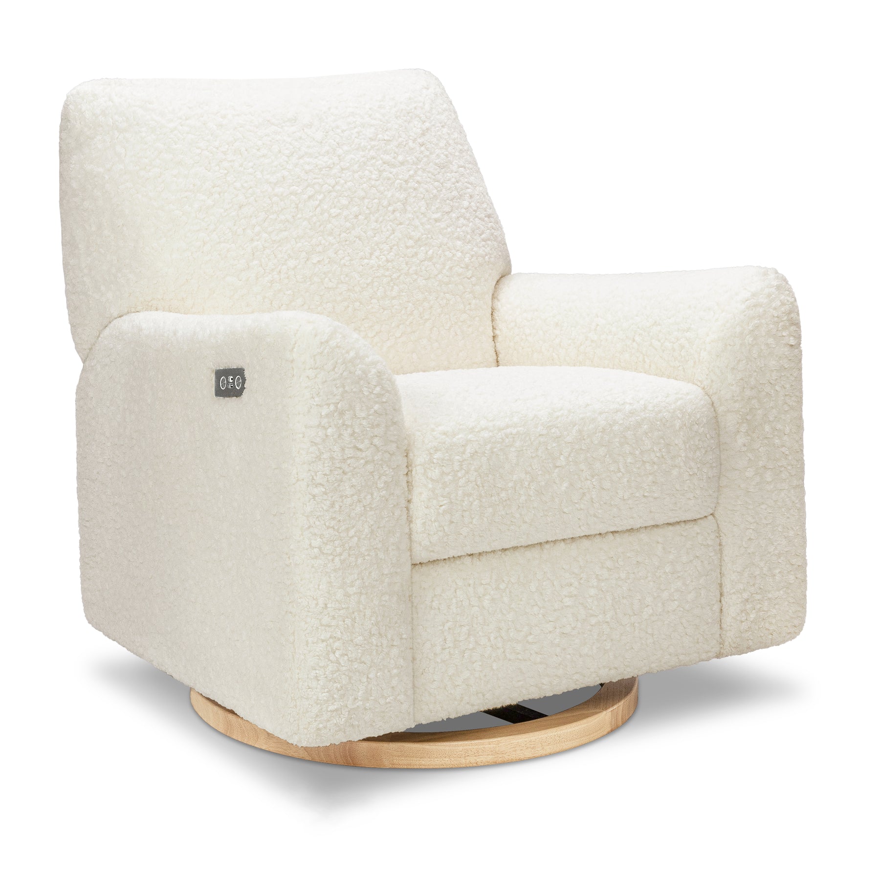 Experience ultimate comfort and modern style with the Sunday Recliner, designed by Nursery Works for Babyletto. An oversized silhouette with cozy sherpa upholstery, plush cushioning and a supportive backrest sit atop a light wood base to create a sleek and Sunday-every-day spot to unwind with your babe.